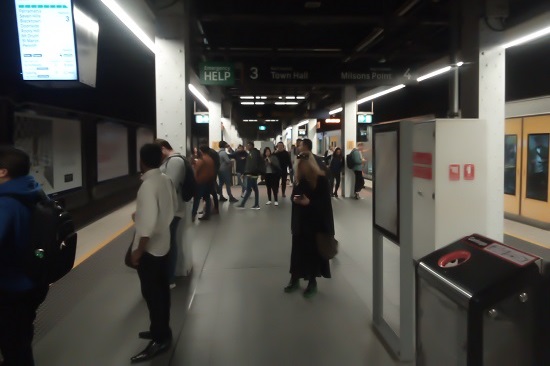 The upper platforms of Wynyard, remind me of many Stations in New York City. The upper platforms of Wynyard sit inside rectangular boxes, held up by vertical steel girders, and crossed by other steel girders. Platforms 1 and 2 and 3 and 4 at Wynyard are not as pretty as St James or Museum, and also not as pretty as Platforms 5 and 6 below. The similarities between the steel boxes of the NYC Subway and the upper platforms of Wynyard are striking.